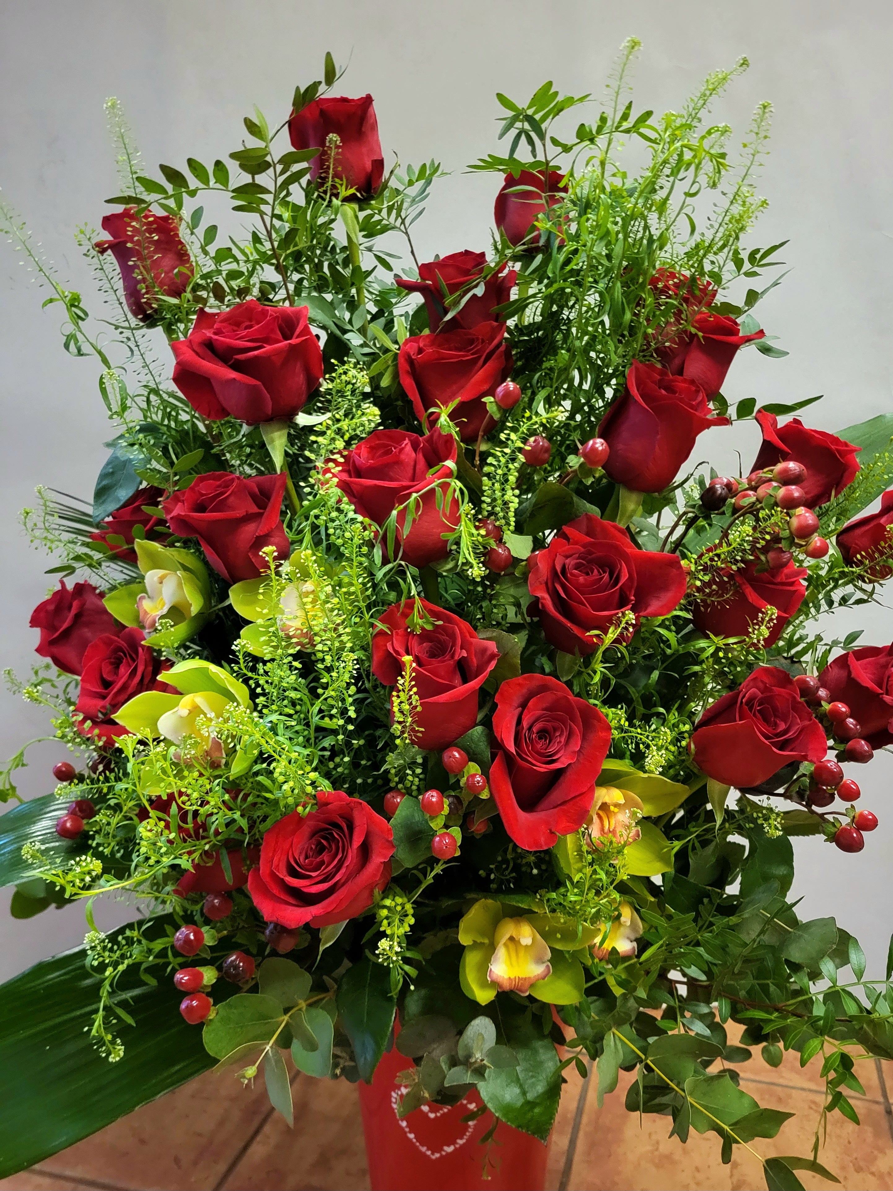 Centro de dos docenas de rosas y orquideas