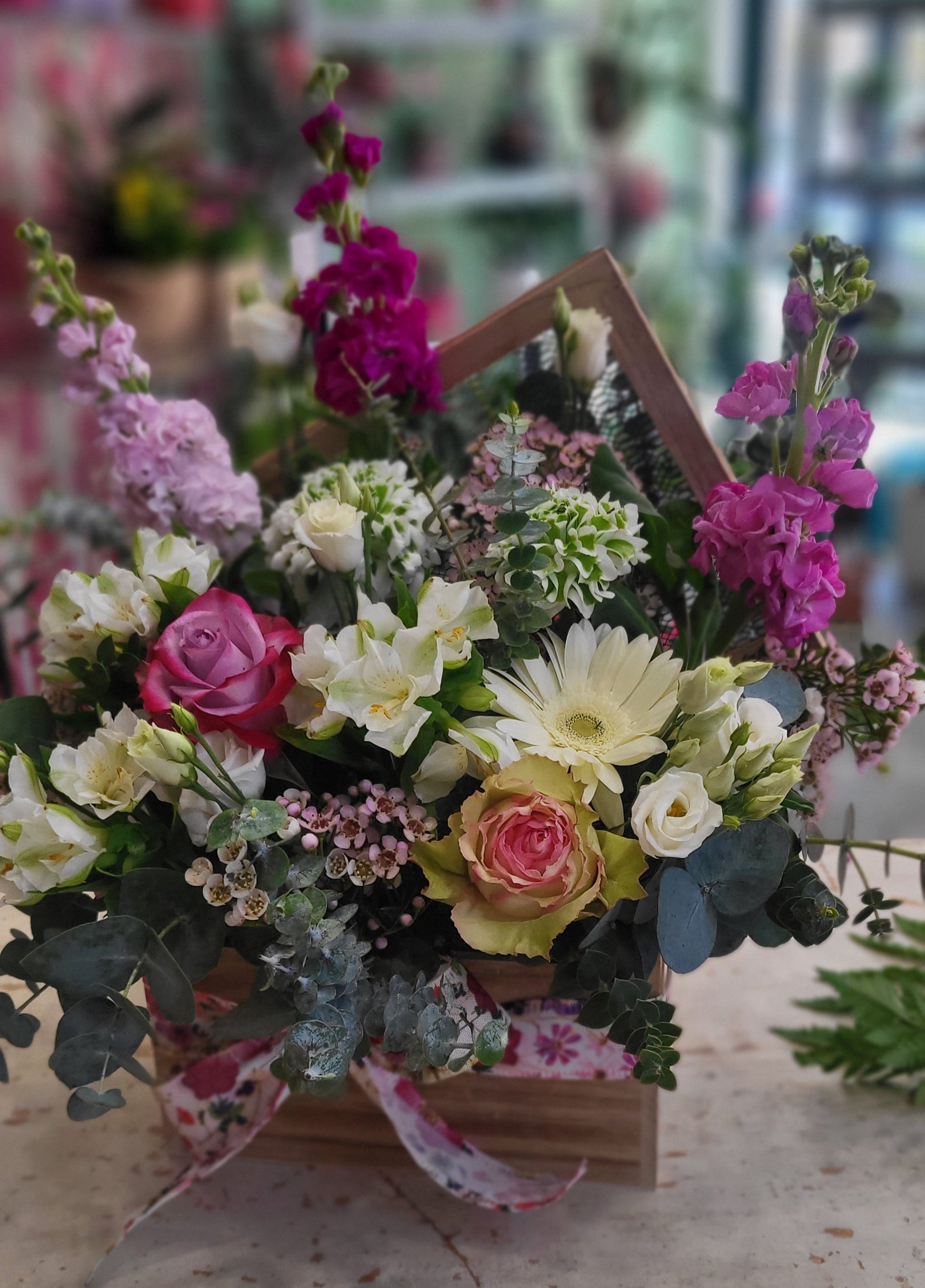 Caja de madera con flores variadas