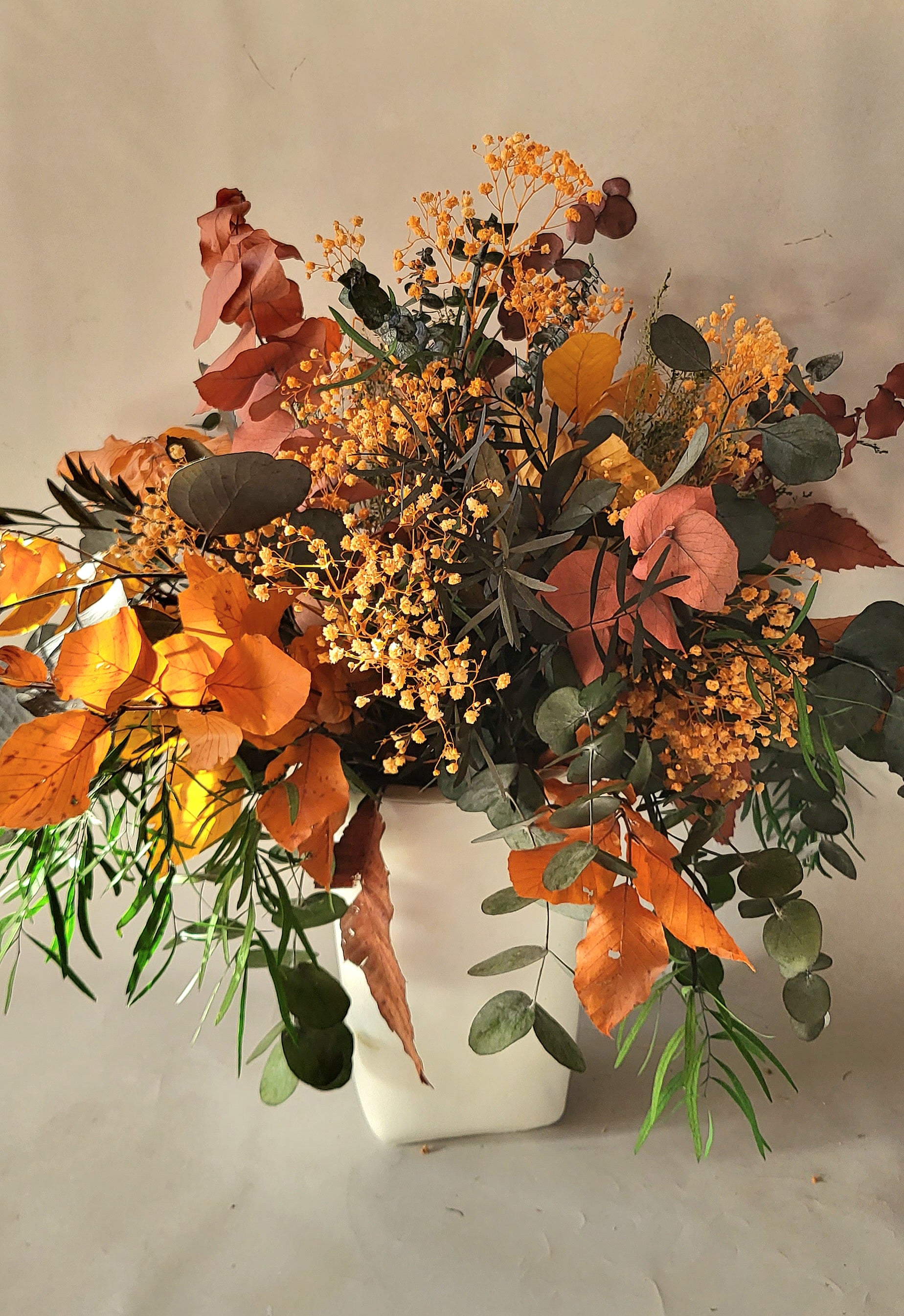 Ramo de flores secas y preservadas en jarrón de cerámica