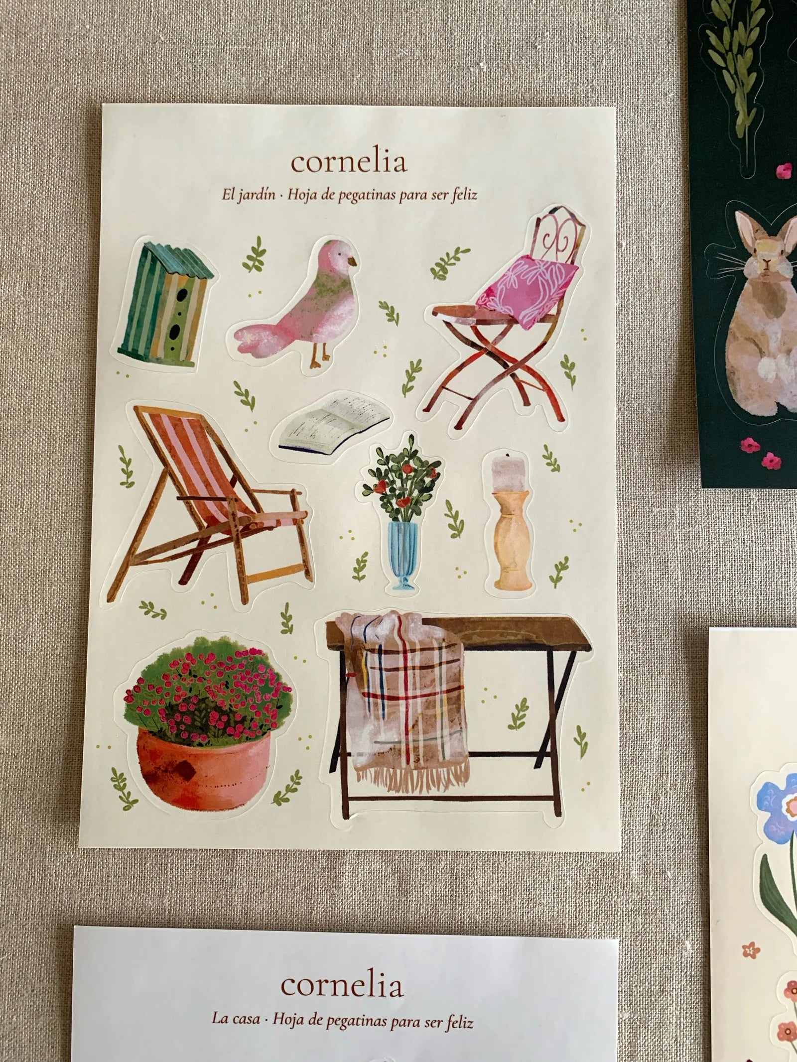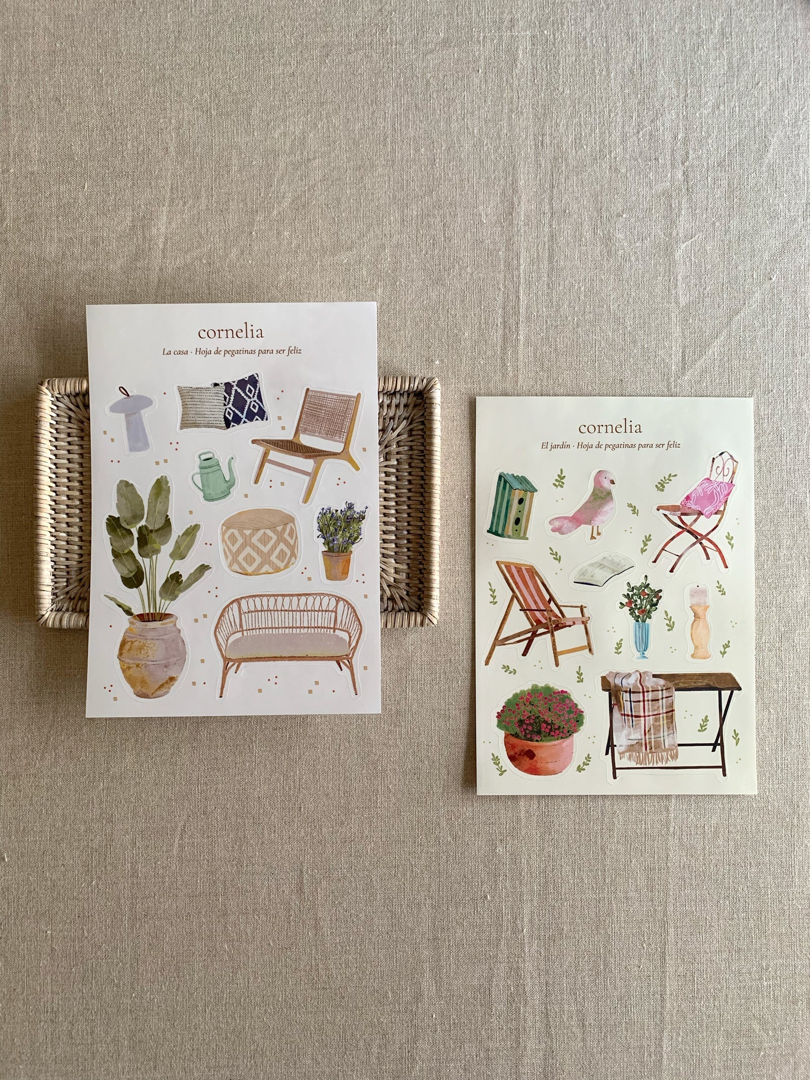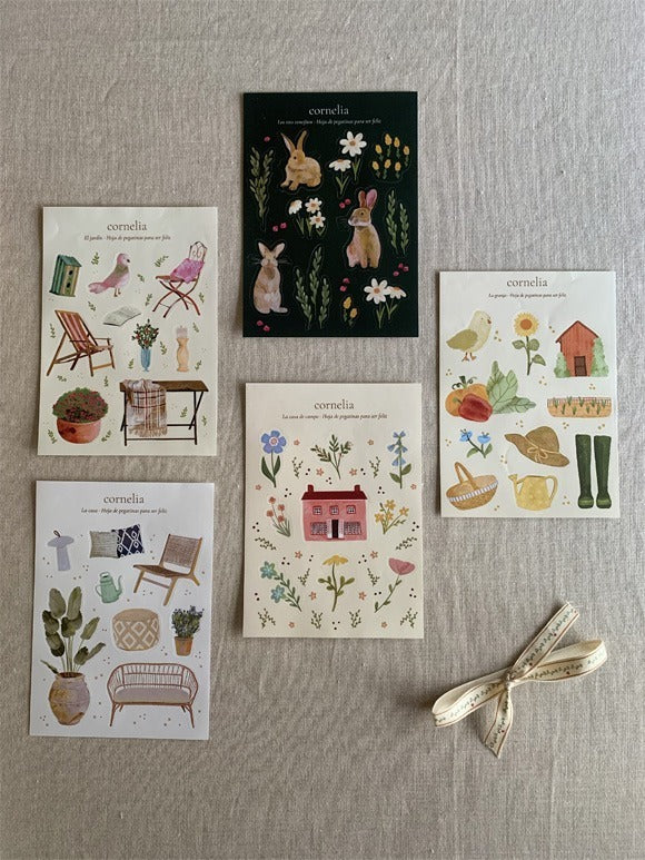Hoja de 9 pegatinas sobre muebles y accesorios con los que podemos decorar un jardín, diseñadas por Cornelia, para jugar y recrear el apasionante mundo de la decoración.