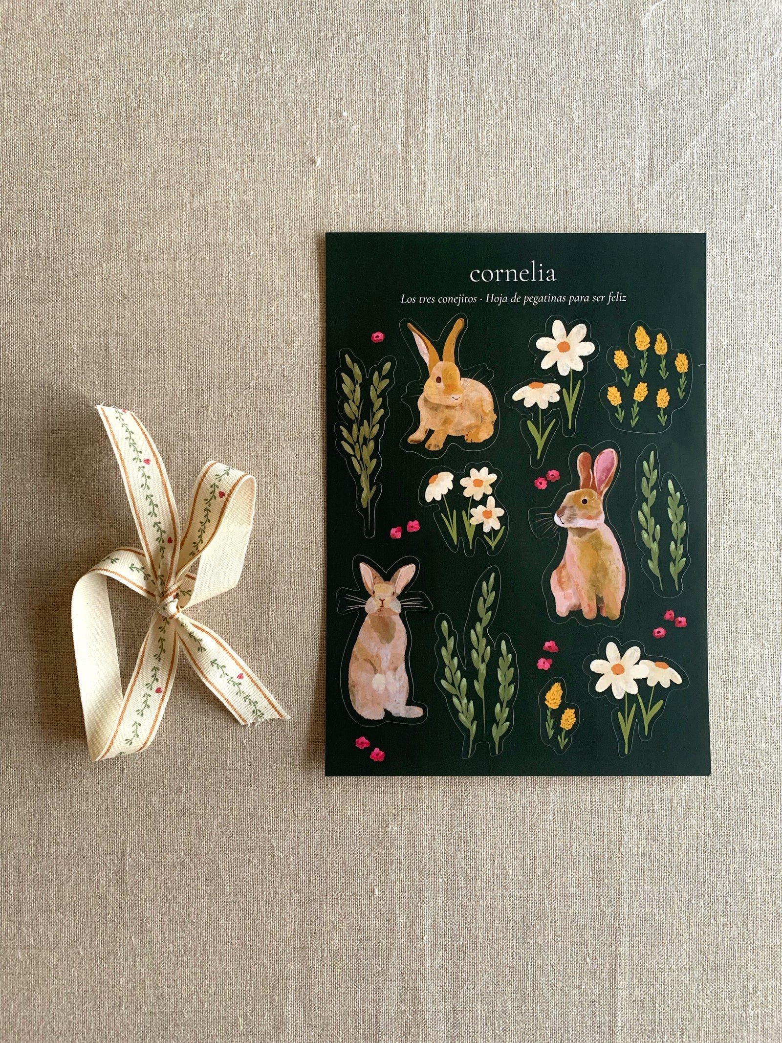 Hoja de 11 pegatinas de conejitos, flores y plantas, diseñadas por Cornelia, para jugar y recrear el apasionante mundo de los animales y el campo.