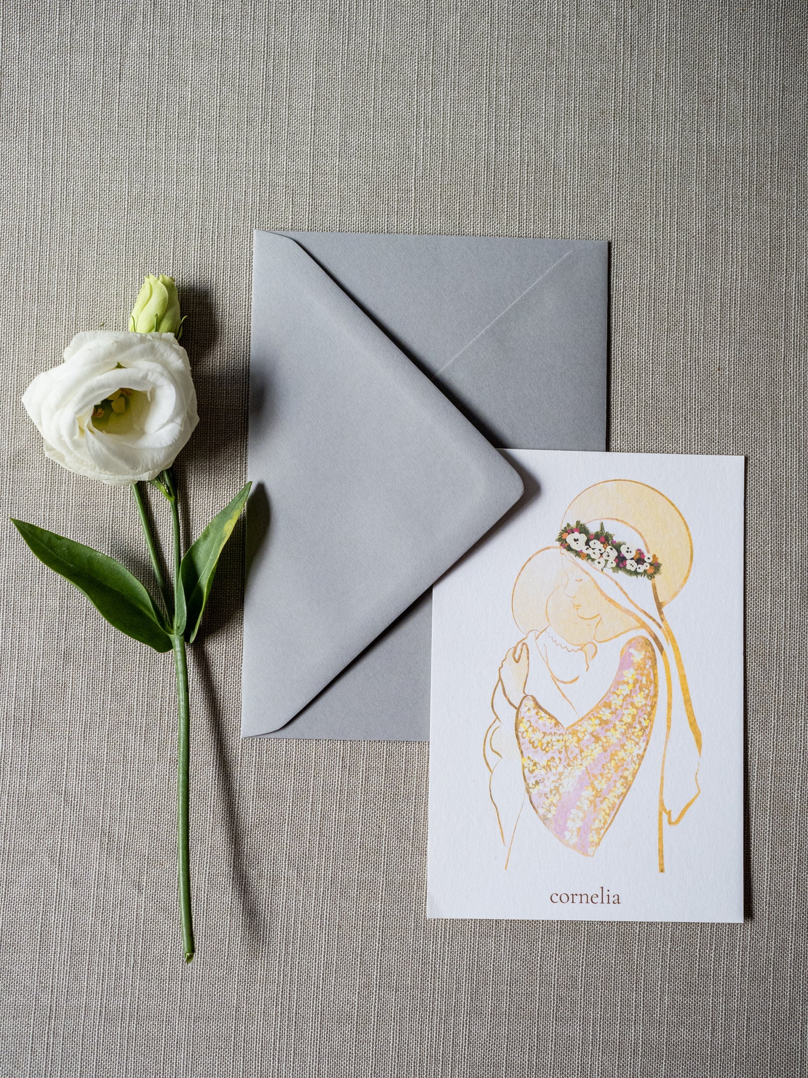 Está impresa en papel de alta gama color hueso y tiene un tamaño A6. Además, va acompañada de un sobre de color, por si la quieres enviar por correo postal.