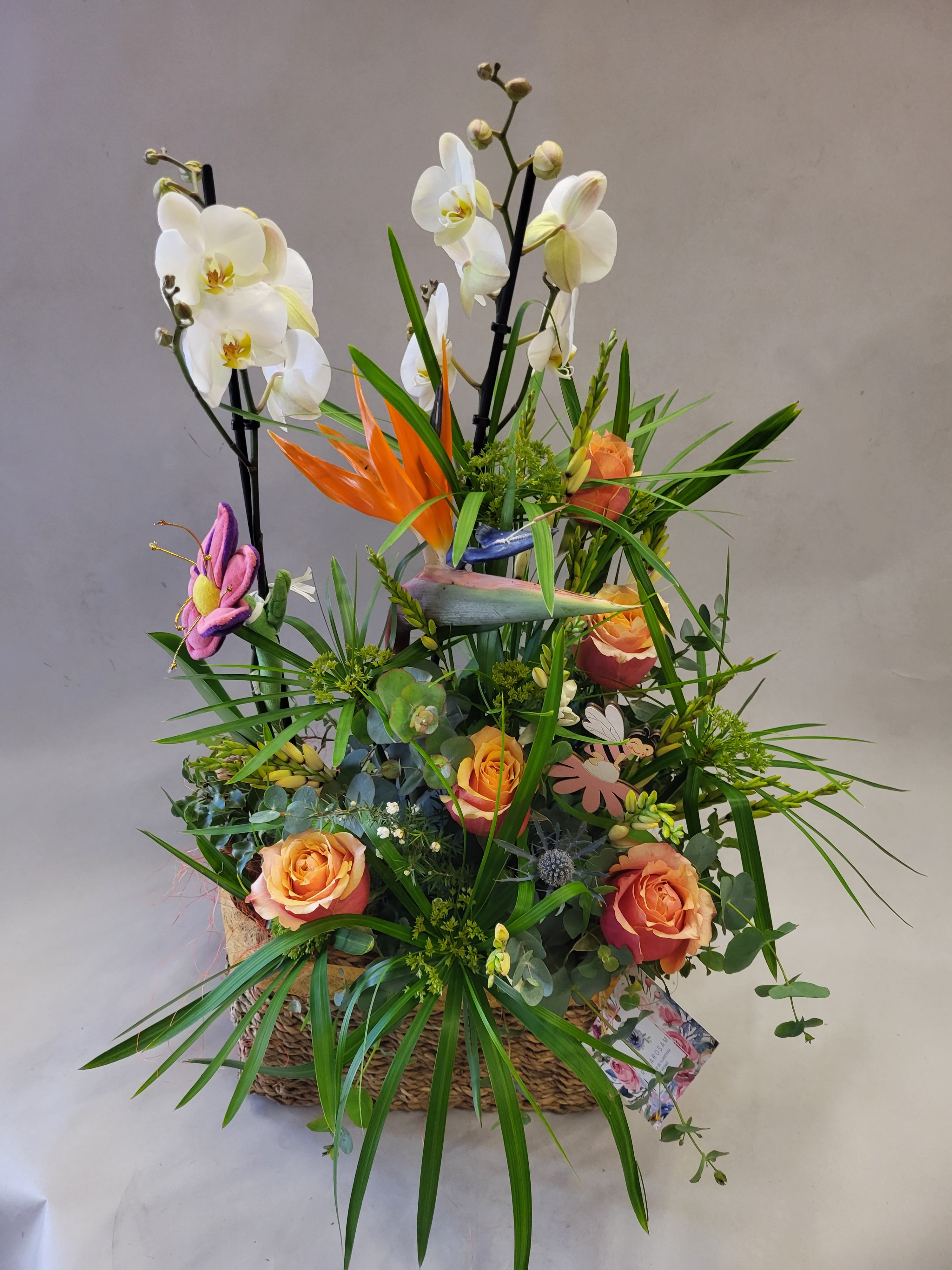 Cesta de flores variadas con planta de orquidea